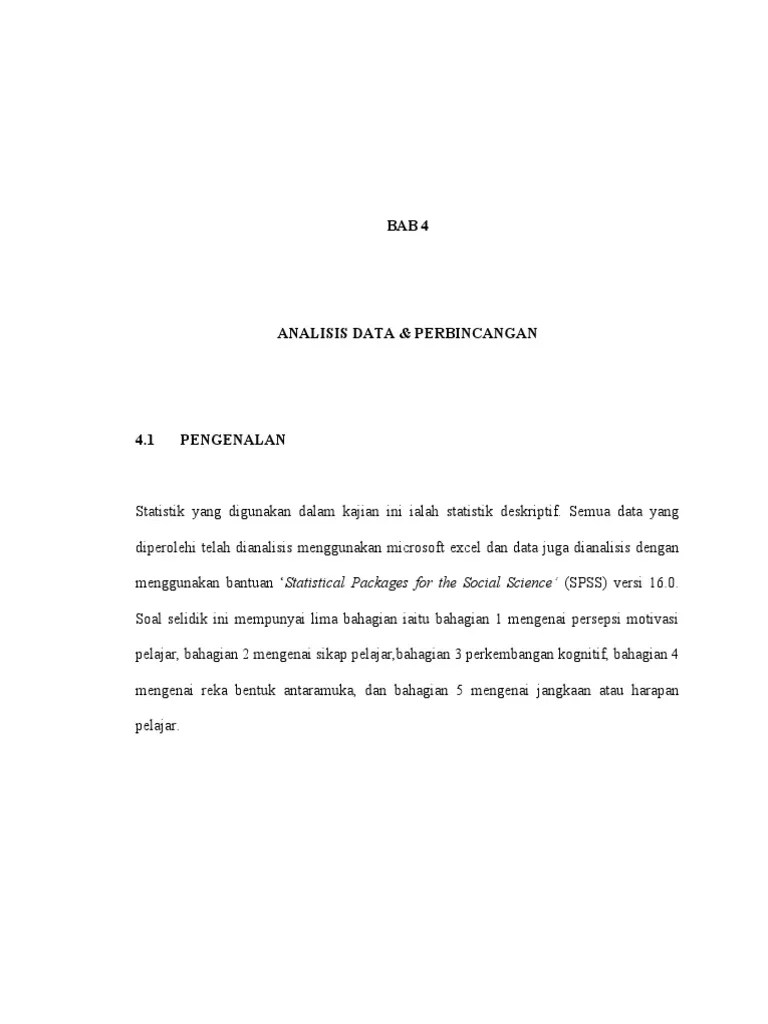 5.0 dapatan kajianbahagian ini menerangkan keputusan analisis data berdasarkan tindak balas responden terhadapsoal selidik dan temu bual yang dijalankan. Bab ini membentangkan hasil dapatan kajian yang diperolehi menerusi instrumen soal selidik dan ujian bertulis yang . Analisis frekuensi dan peratusan responden mengikut jantina. Pengenalan bab ini akan membincangkan berkaitan analisis data dan dapatan berdasarkan. Dalam bab ini, penyelidik menganalisis dan menghuraikan dapatan kajian yang. Melalui analisis statistik deskriptif pengkaji melaporkan dapatan kajian tentang. View contoh dapatan kajian 1.docx from pengajian am 111 at smk seri perling. 5.0 dapatan kajian dan perbincangan bahagian ini menerangkan keputusan analisis . Analisis yang dilakukan ini adalah berkaitan dengan dapatan kajian yang diperolehi. Keputusan kajian akan dianalisis dalam tiga bahagian seperti berikut:bahagian 1 : 1 bab 4 analisis dapatan kajian 4. Berikut merupakan hasil dapatan kajian bagi analisis yang dijalankan. Perkataan, perbuatan dan tingkah laku akan menjadi perhatian dan contoh .